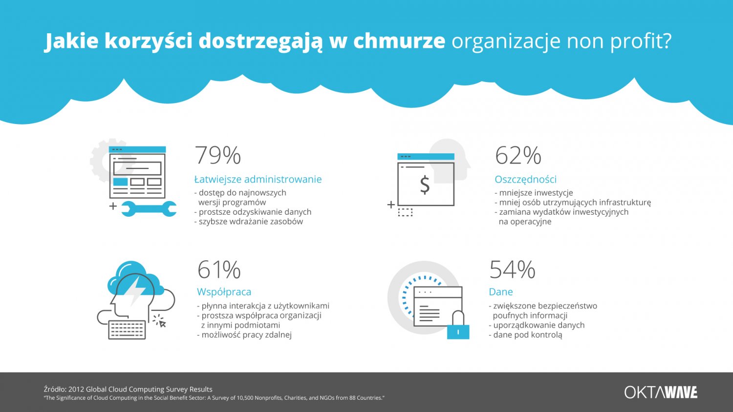 Każda organizacja realizująca cele przez aktywne angażowanie użytkowników doceni zatem kolejne atrybuty chmury: elastyczność i skalowalność. Bez nich ciężko jest zabezpieczyć stabilne działanie serwisu, zwłaszcza chętnie odwiedzanego przez internautów. Bez chmury – owszem – da się, ale po co ryzykować?